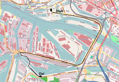 Start ist um 13:15 Uhr am Sandtorpark in der Hafencity.
